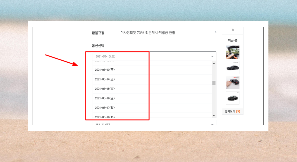 5. 렌트카의 경우 이용하는 날짜에 따라 이용료 차이가 있을 수 있어요. 보통 제주도와 같은 여행지는 주말에 조금 더 비싸죠. 옵션 선택에서 이용하고자 하는 날짜를 선택해 주세요.