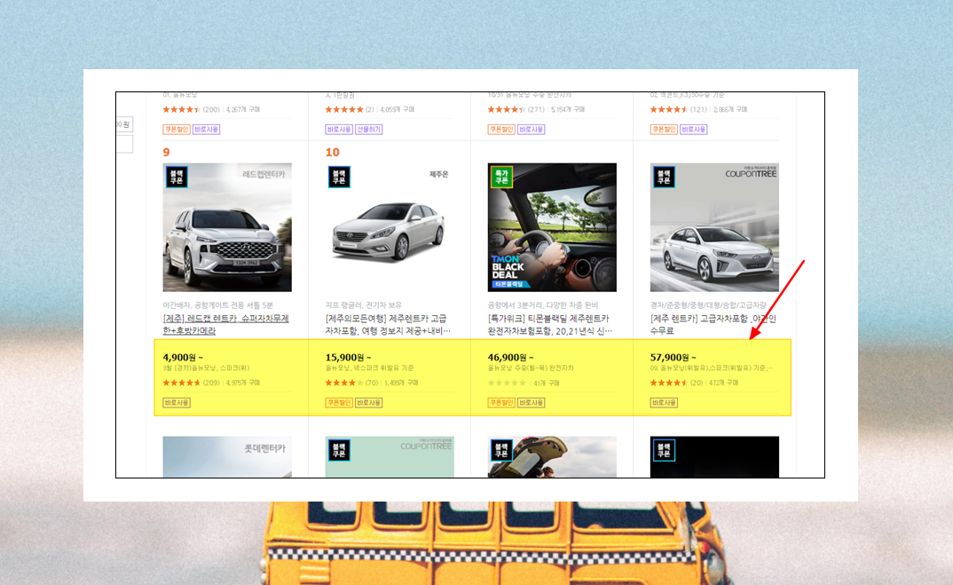 2. 저는 온라인으로 제주도 렌트카를 알아볼 때 티몬 사이트를 이용하는데요. 이곳에서는 쇼핑몰과 같이 일반 상품은 물론이고, 렌트카 예약 서비스도 제공하고 있어요. 이용 금액이 명확하게 표시되어 있기 때문에 여러 업체 간에 가격비교를 하기에도 정말 좋죠.