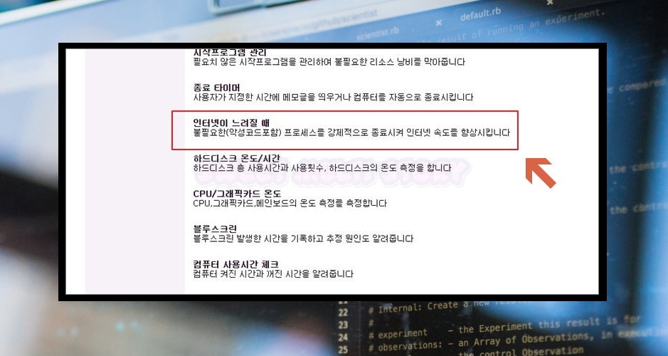 ▲ 인터넷 속도 향상을 위해 사용할 고클린의 기능은 "인터넷이 느려질 때"입니다. 불필요한 프로세스를 종료 시켜서 속도를 향상 시킬 수 있다고 합니다.