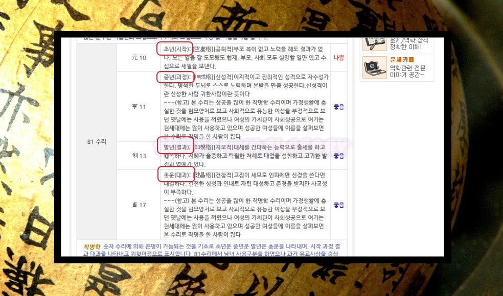 81 수리를 통해 초년, 중년, 말년, 총운도 알아볼 수 있어요. 한자 이름을 통해 각 단계에 좋고, 나쁜지 알 수 있도록 표시가 되어 있네요.