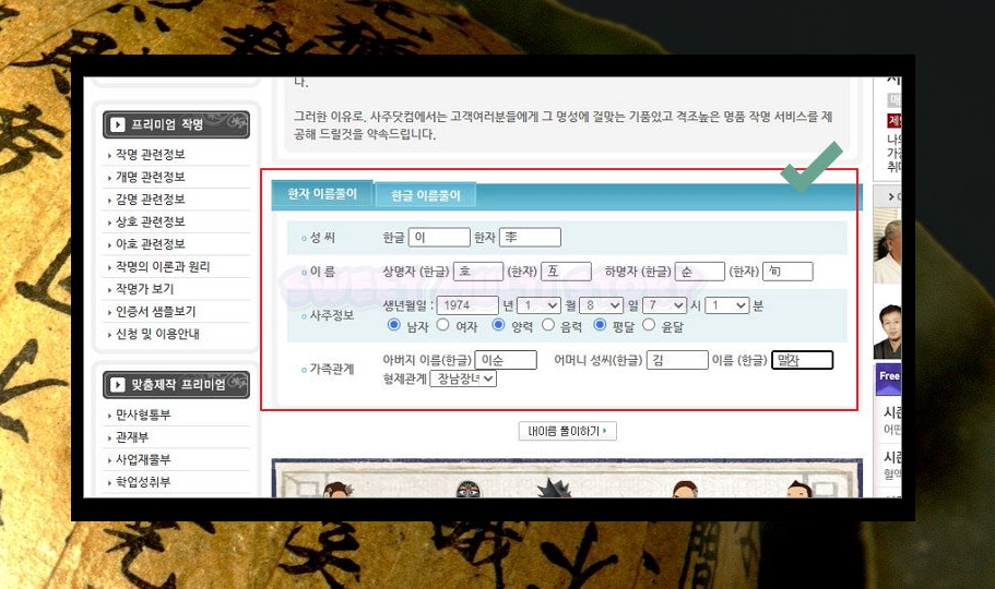 이름을 짓거나 변경할 때 반드시 고려해야 할 요소들이 있습니다. 사용하는 한자의 의미가 좋아야 하고, 개인의 사주에 긍정적인 영향을 주는 것이 중요합니다. 이런 점들을 파악하기 위해선 성명학에 대한 이해가 필요한데요. 성명학에 대한 지식이 없어도 자신의 한자 이름에 대하여 상세한 뜻풀이를 하는 서비스를 이용해 보겠습니다. 사용법도 간단합니다.