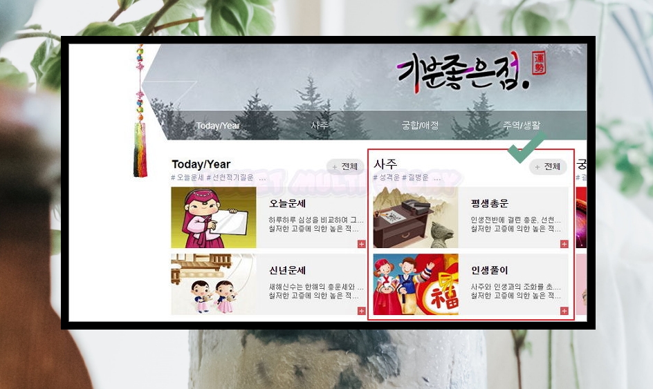 2. 기분 좋은 점 사이트에 접속했어요. 본격적으로 사주팔자를 보는 법을 알려드릴게요. 메인화면 중앙을 보면 평생총운과 인생풀이를 보기 가능한 사주 카테고리를 선택해 주세요.