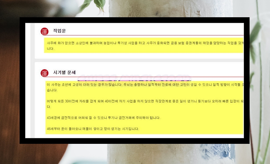 사람의 일생에서 초년, 중년, 장년에 따라 들어오는 운이 다를 수 있어요. 시기별 운세를 통해 간단하게 보기 가능한데요. 더 나아가 어떤 것을 주의해야 하는지 알려줘요.