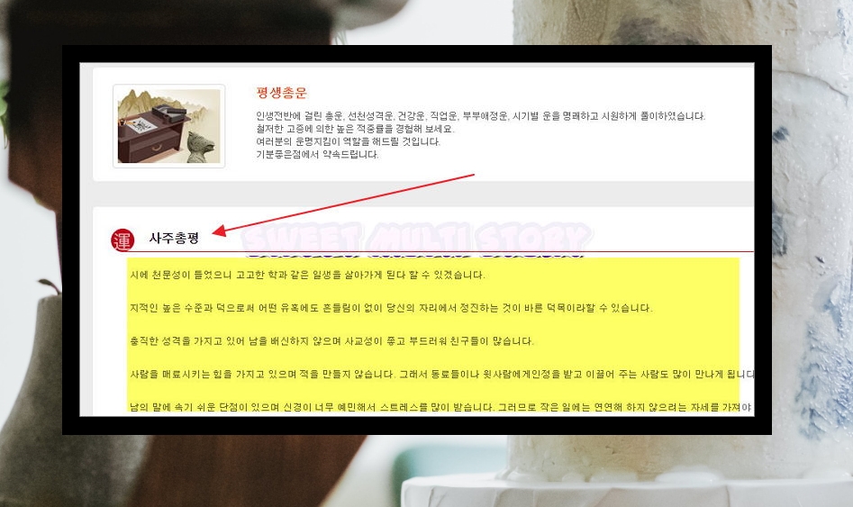 4. 새로운 페이지가 열리면서 사주팔자 풀이를 무료로 확인할 수 있는데요. 가장 먼저 살펴볼 수 있는 것은 총평이에요. 어떤 인생을 살아가는지 알 수 있고, 어떠한 삶의 태도를 지니는 것이 좋은지 알려줘요. 이 밖에도 성격이나 힘든 일 등에 대한 내용을 만나볼 수 있어요.