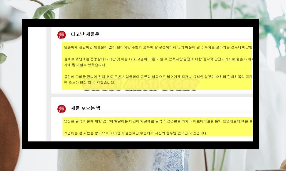 6. 경제는 누구에게나 관심 거리인데요. 사주팔자를 가지고, 타고난 재물과 재물 모으는 법도 알아볼 수 있어요.