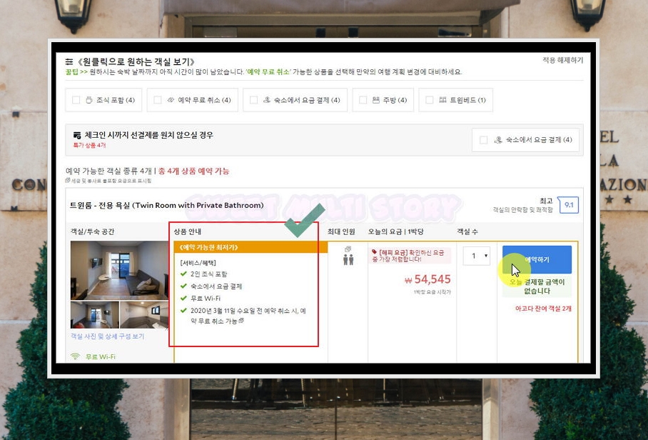 제가 선호하는 조건과 기준으로 설정해 보았는데요. 이로 인해 조식이 포함되고, 위치도 좋은 저렴한 객실을 찾을 수 있었어요. 예약을 하고 싶다면 사이트에서 숙소 사진을 클릭하면 돼요.