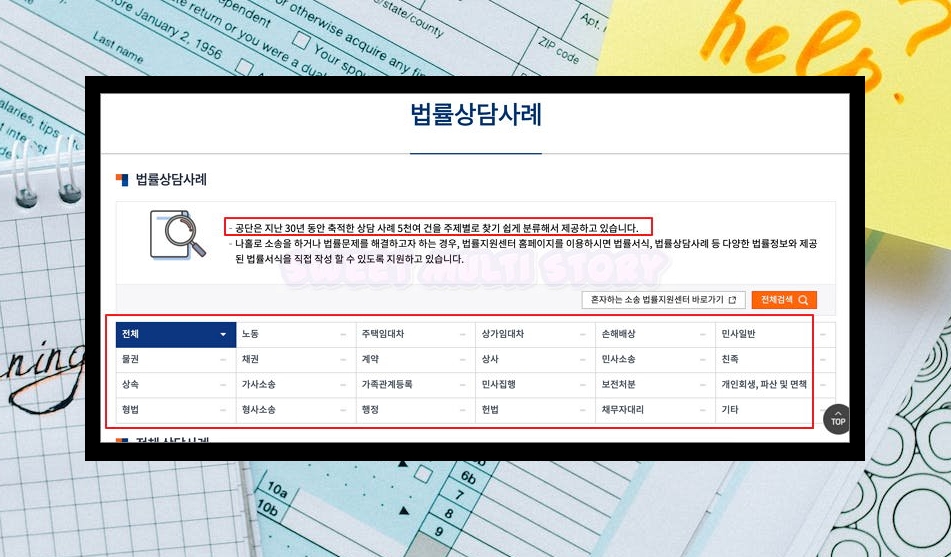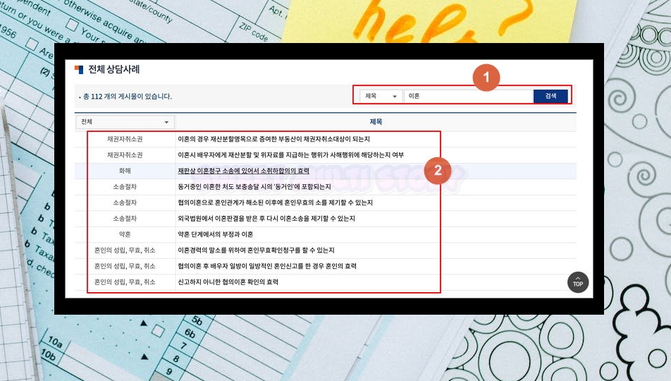 2. 이곳에서는 이혼 관련 양식을 다운 받는 것은 물론이고, 여러 가지 법적인 서비스를 제공 받을 수 있는 곳이에요. 상담도 받을 수 있고, 법률 구조 신청도 가능하죠. 양식을 작성하면서 궁금한 점이 있다면 상담사례를 살펴보는 것도 좋아요.