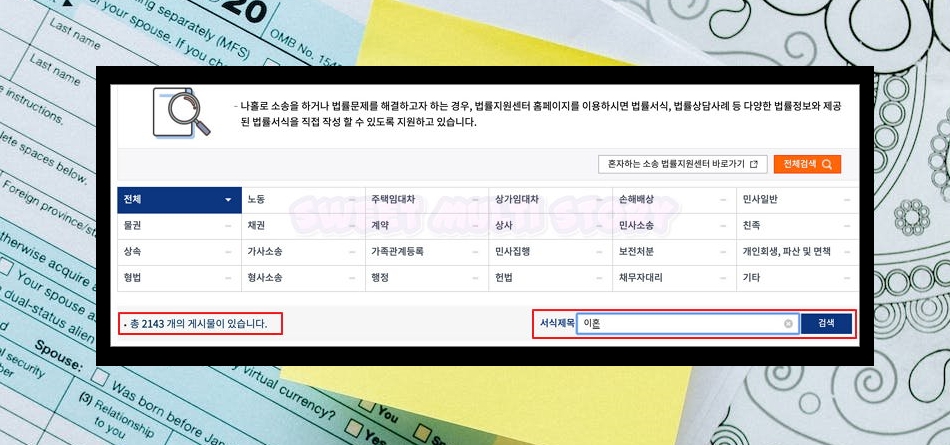 4. 새롭게 열린 페이지에서는 2143개의 법률 양식을 만날 수 있어요. 이혼은 물론이고, 노동, 계약, 헌법, 행정, 형사소송, 민사소송 등 여러 상황에 사용할 수 있는 양식을 쉽게 다운 받을 수 있도록 무료로 제공되고 있어요.