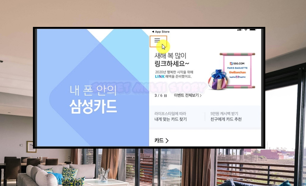 2. 아파트 관리비를 납부하려는 카드에 대한 어플을 실행해 보세요. 여러 상품에 대한 안내와 사용 금액에 대한 내용을 확인할 수 있을 거에요. 좌측 상단에 있는 전체 메뉴 버튼을 클릭해 주세요.