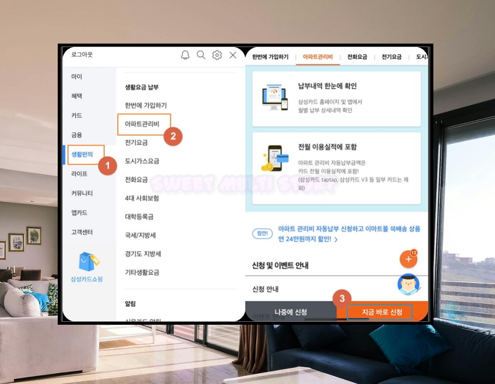 해당 서비스 화면이 나타났어요. 관리비 납부를 삼성카드로 진행하면 이마트몰 쓱배송 상품에 대하여 할인 혜택도 준다고 해요. 이런 식으로 기업에서 혜택을 주는 서비스를 제공하고 있어요.