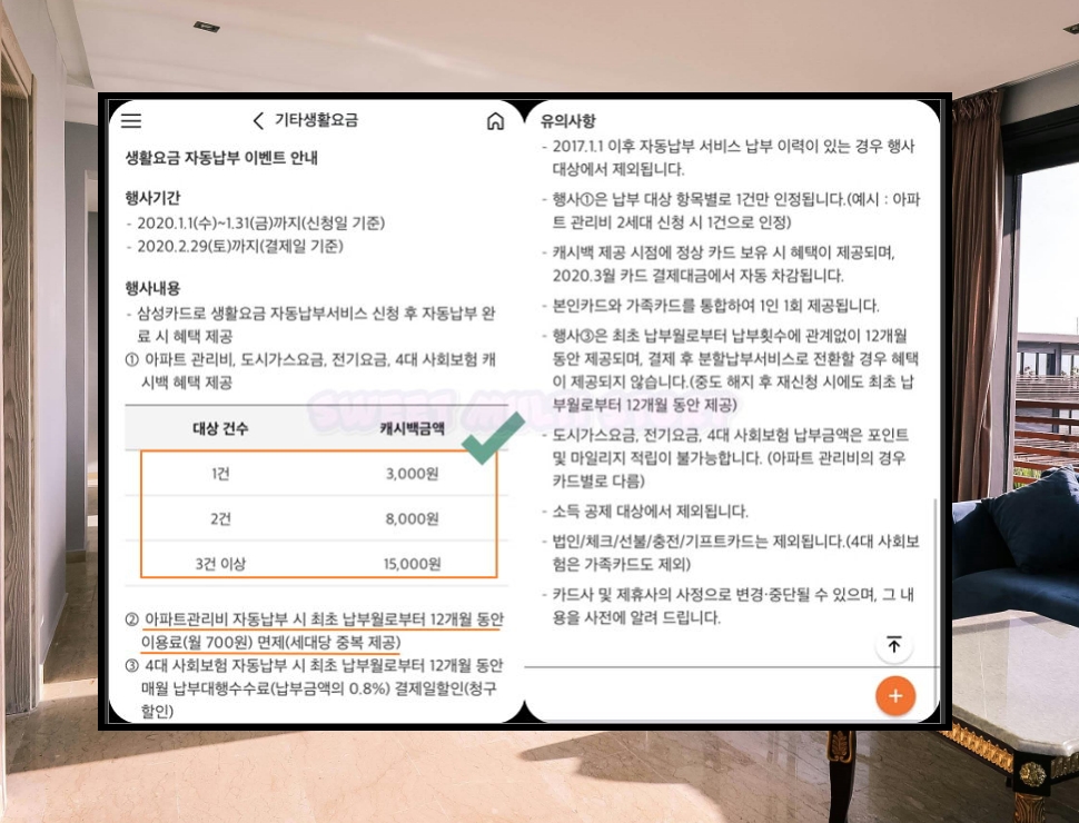 5. 참고로 삼성카드의 경우에는 생활요금에 대하여 자동납부를 신청하면 캐시백 혜택을 준다고 해요. 1건에 3천원, 2건에 8천원, 3건 이상은 15,000원인데요. 여기에 더하여 아파트 관리비 카드납부 이용금액에 대해 12개월 동안 면제해준다고 해요.