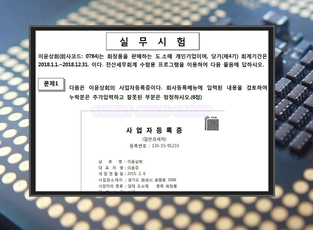 5. 다운 받은 압축파일을 풀어보면 여러 문서 파일이 들어있는데요. 답안지와 기출문제 입니다. 사업자등록증을 검토한 후 누락분은 추가를 하고, 잘못된 부분은 정정을 하는 문제가 보이네요. 기존에 시행 되었던 문제이기 때문에 비슷한 유형의 문제가 또 출제될 가능성이 있습니다.