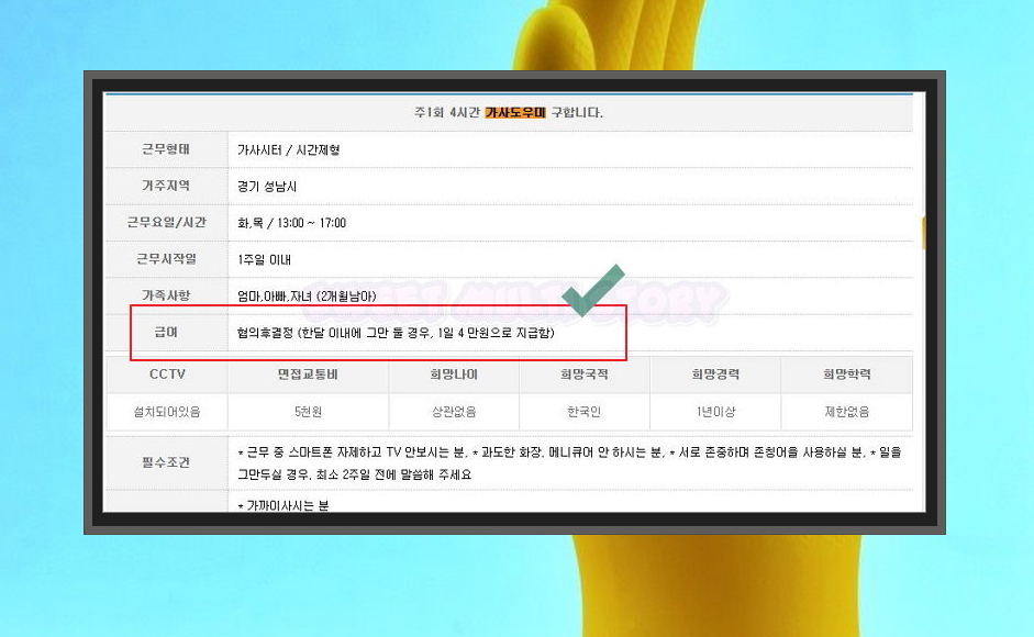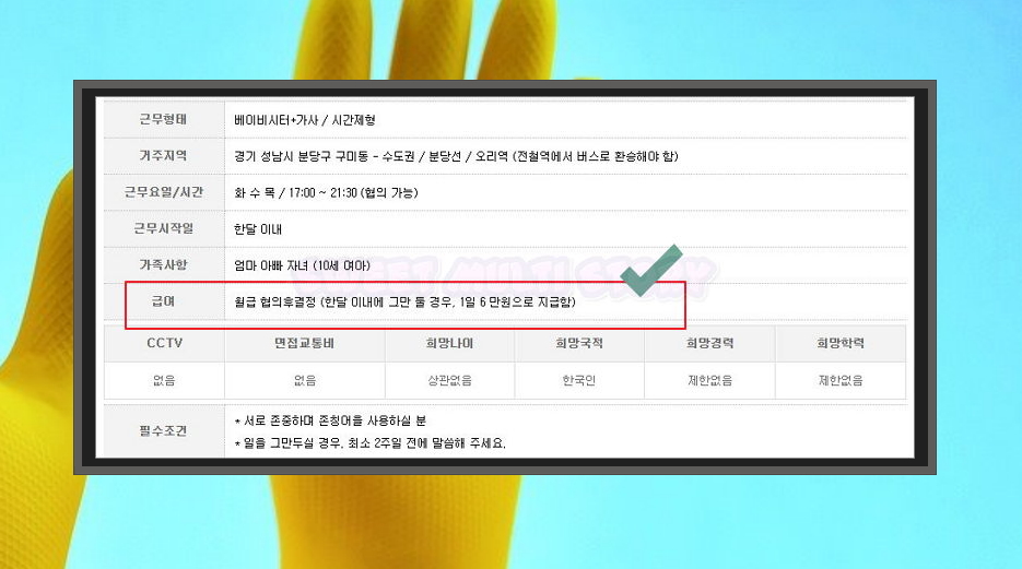6. 세 번째 공고의 경우에는 오후 5시부터 오후 9시 30분까지 하루에 3시간 30분 동안 일을 해야 하는 조건인데요. 한달 이내 가사도우미 일를 그만두는 경우 1일 6만원으로 지급을 한다고 합니다. 이를 기준으로 계산해보면 시급이 1.7만원 정도가 됩니다. 저녁에 근무해야 하고, 일주일에 3일만 일을 할 수 있지만, 다른 공고에 비해 시급이 높은 편이네요.