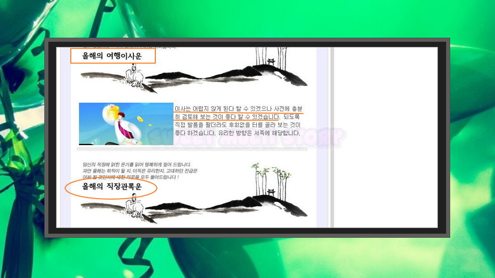 8. 월별운의 경우에는 1월부터 6월까지는 볼 필요가 없고요. 7월부터 보시면 됩니다. 달마다 들어오는 운의 종류가 달라요. 시험을 잘 볼 수 있는 달이 있고, 애인을 만나게 되는 달이 있기도 합니다.