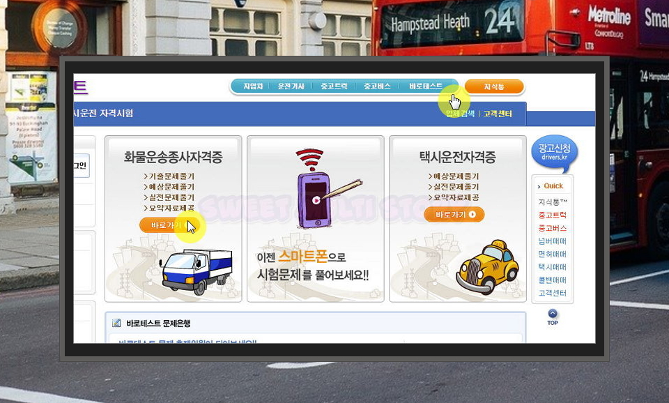 6. 드라이버스에 접속하게 되면 홈페이지 상단에 있는 바로테스트 버튼을 눌러주세요. 아무리 찾아보아도 버스운송 자격시험에 대한 내용은 없는데요. 일단 저를 믿고 화물운송종사자격증을 클릭해 주세요.