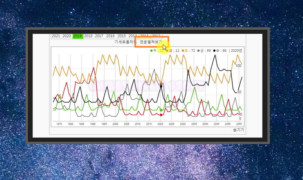 5. 만세력 프로그램에서 연운펼쳐보기 버튼을 누르면 99세까지의 연운을 알아볼 수 있어요. 연운은 1년 주기로 변하는 운인데요. 적혀 있는 것을 가지고 기세를 알아볼 수 있어요.