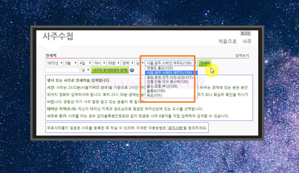 해당 사이트에서 지역을 입력하는 곳에 본인의 태어난 곳이 나오지 않을 수 있어요. 그런 경우는 찾고자 하는 지역과 경도상으로 동일한 위치에 있는 도시를 선택하면 돼요. 모두 입력하셨다면 만세력 버튼을 눌러주세요.