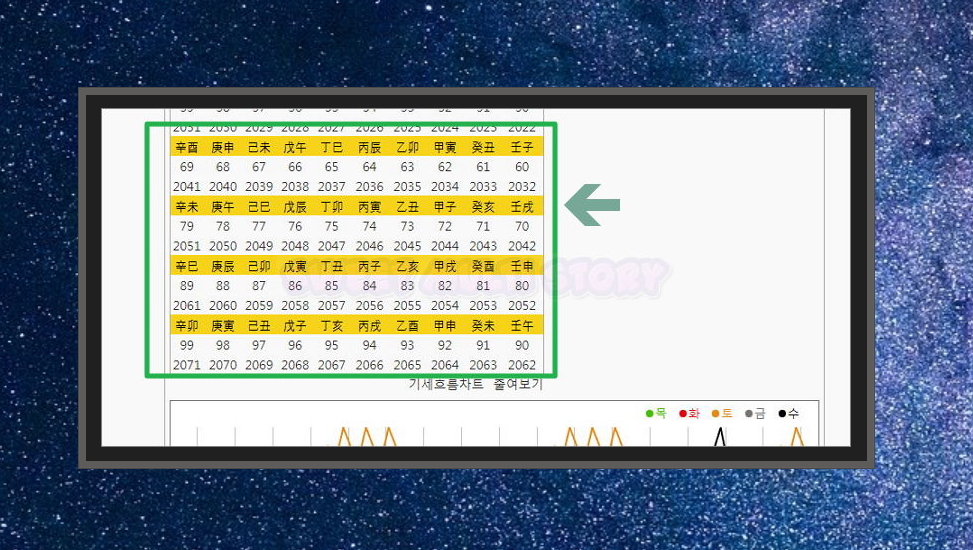3. 프로그램을 돌린 결과 사주명식과 육친도 또는 법륜도가 나타났어요. 사주보는 방법을 따로 공부하지 않은 분이라면 어떤 의미인지 알 길이 없죠. 일단 만세력 프로그램을 이용하는 방법을 알려드린 후 사주보는 방법을 알려드리도록 할게요. 대운 표의 하단에 있는 기세흐름차트를 클릭해 보세요.