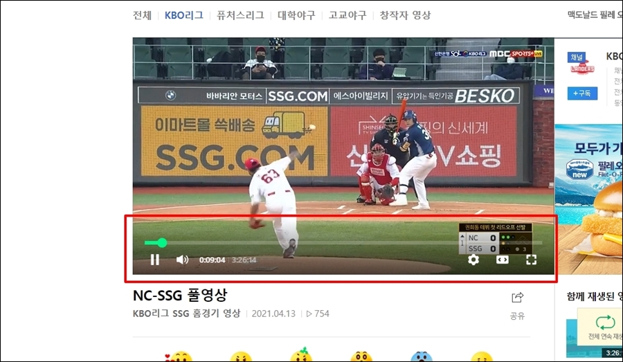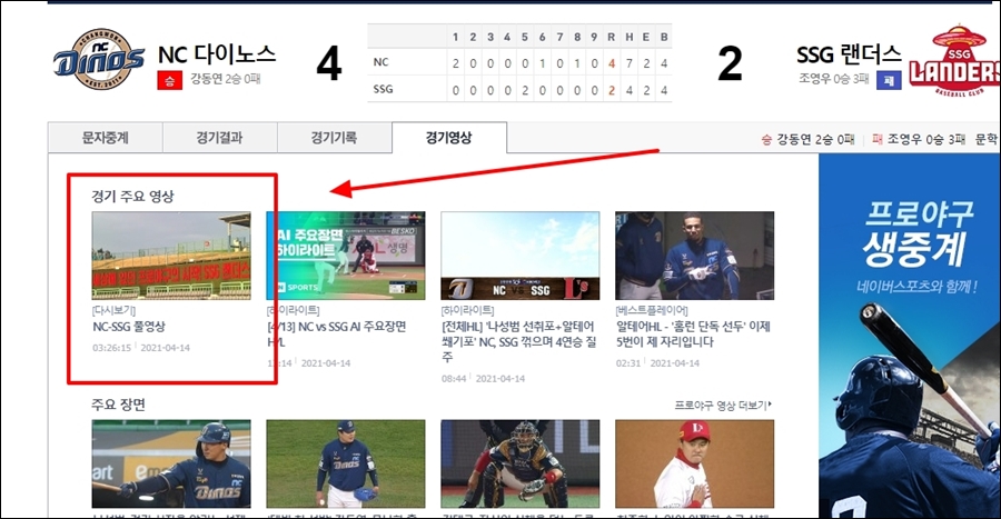 그럼 과거이 진행이 된 프로야구 경기에 대한 풀영상을 볼 수 있습니다.