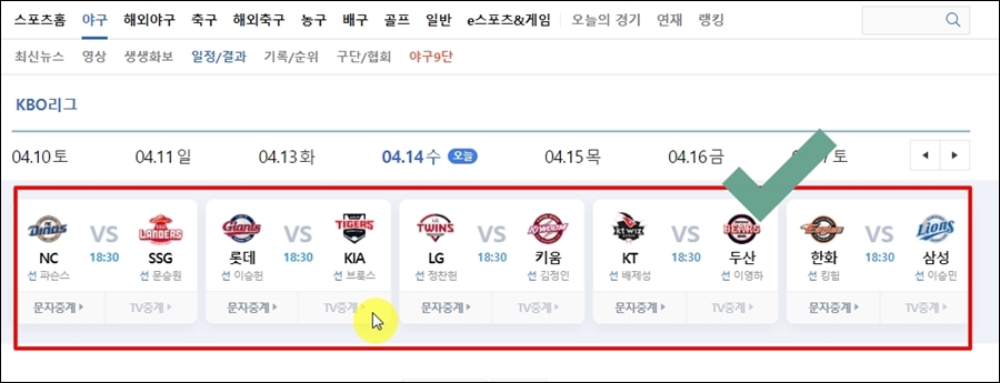 경기 관련 정보를 보면 문자중계와 TV중계를 선택할 수 있도록 되어 있는데요. TV중계 버튼이 활성화되면 바로 사이트에서 야구경기에 대한 방송보기를 할 수 있습니다.
