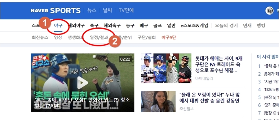 국내 프로 야구에 관련된 최신뉴스, 영상, 생생화보, 일정, 기록, 순위, 결과 등을 볼 수 있는데요.