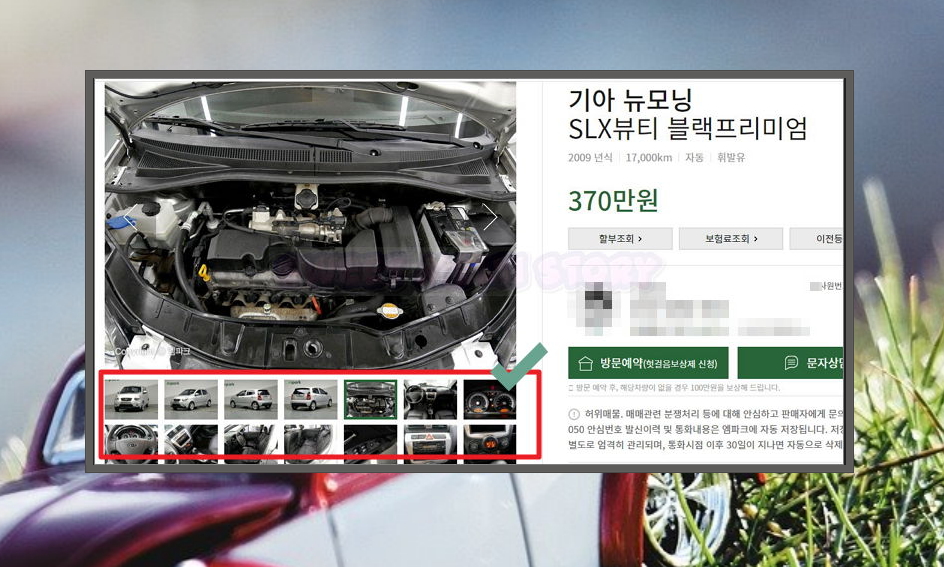 6. 원하는 모델을 클릭하면 이렇게 상세한 정보를 확인할 수 있어요. 상세한 경차 중고차 가격과 함께 많은 사진을 확인할 수 있어요. 꼼꼼히 확인해 보세요.