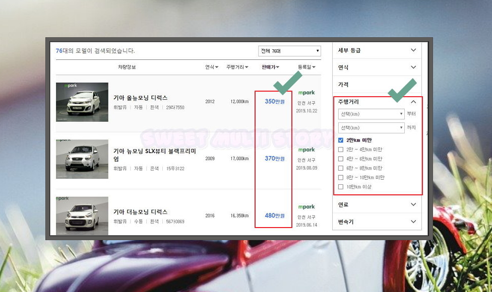 5. 저는 경차 중고차를 살 때 주행거리를 중요하게 생각해요. 2만 km 미만으로 운행한 차량을 선호하는데요. 2만 km 미만으로 검색해보니 가격이 350만원인 차량도 있네요. 해당 모델은 이미 팔렸고요. 그 다음으로 낮은 370만원짜리 기아 뉴모닝 SLX 뷰티 블랙 프리미엄은 남았네요.