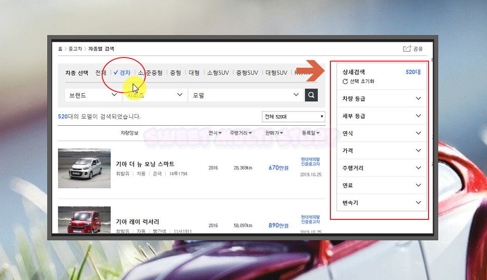 4. 차종 선택을 보시면 소형, 준중형, 중형, 대형, 소형SUV, 대형SUV, RV 등을 선택할 수 있게 되어 있어요. 경차를 선택해 보니 520대의 모델이 검색되었네요. 시세를 살펴보니 꽤 저렴하네요. 상세검색을 통해 자신이 원하는 조건을 입력해 보세요. 차량 등급, 세부 등급, 가격, 주행거리, 연료, 연식 등을 지정할 수 있어요.
