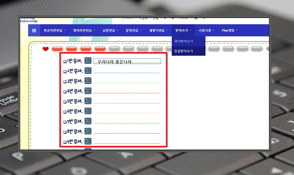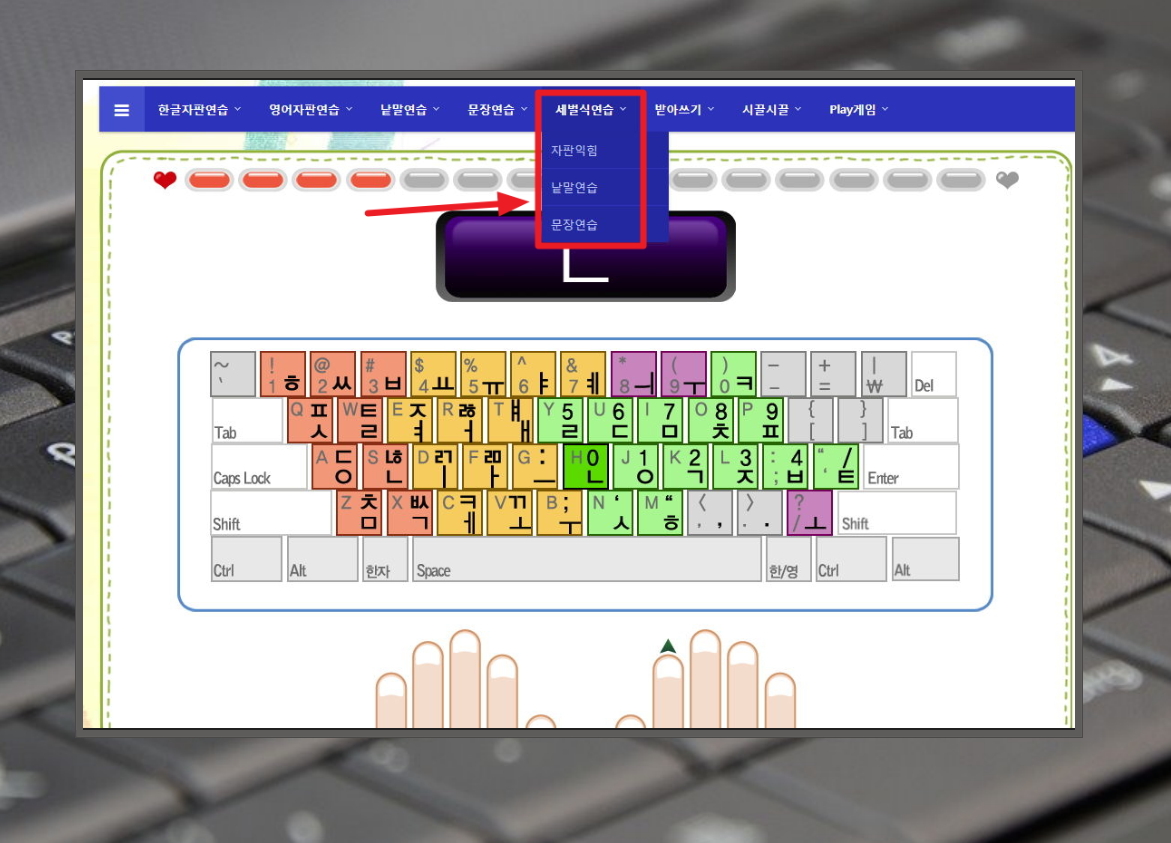 제가 이용하는 사이트의 경우에는 손가락 위치를 제대로 잡는 습관을 들이기에 좋은데요. 정확한 손가락 위치를 알려주기 때문이에요. 그 다음에 익혀야 하는 단어 쓰기, 문장 쓰기 등 여러 가지 과정을 제공하오니 함께 이용하면 됩니다.