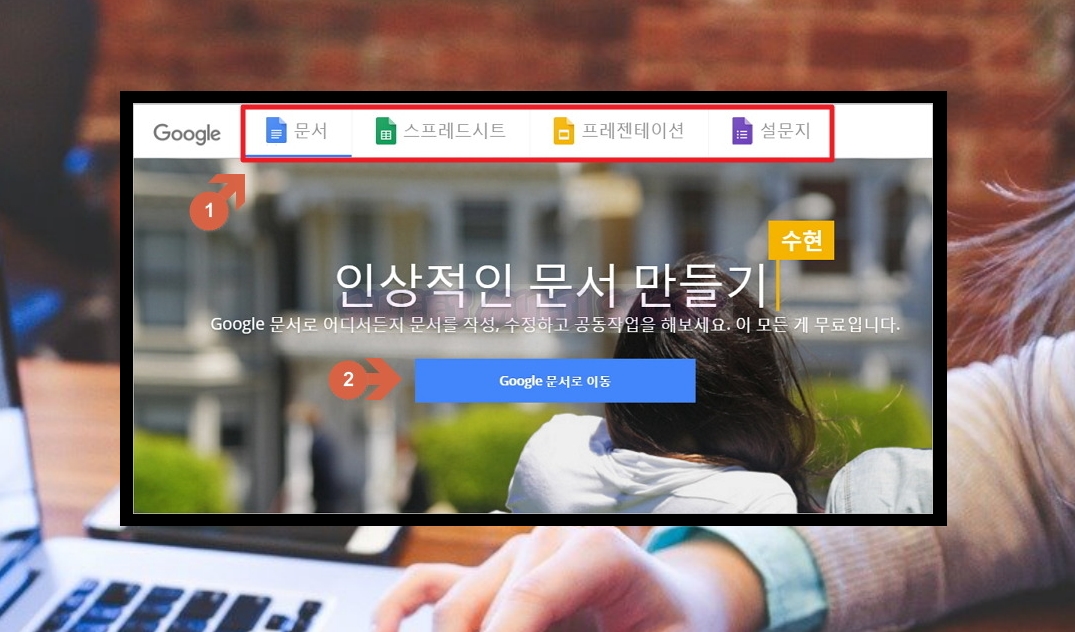 전 단계에서 '구글 문서로 이동'을 누르셨다면 위와 같은 메인화면이 나오는데요. ①번을 누르면 내 컴퓨터에 있는 워드파일을 열 수 있답니다. 물론 수정도 가능하고요. 새로운 문서를 작성하고 싶다면 ②번을 눌러 '새 파일 만들기'를 실행해보세요.