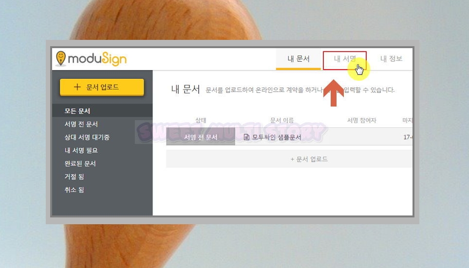 로그인을 하면 위와 같은 화면이 나타나는데요. 오른쪽 위에 보시면 '내 서명'이 있습니다. 해당 버튼을 통해 인터넷에서 이용할 수 있는 서명이나 도장 이미지를 만들기 가능합니다.