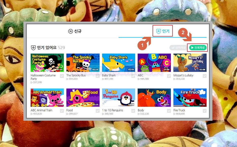 왼쪽 위에 보면 인기곡의 총 개수가 529개로 나타나는데요. 우측 상단에 있는 '전체재생'을 누르면 한번 클릭으로 모두 듣기가 가능합니다. 가장 많이 들은 동요는 'Halloween Costume Party'인데요. 재생 횟수가 53만 건이나 된답니다. 아직까지 쥬니버를 이용해보지 않은 학부모님들은 꼭 아이들에게 알려주세요.