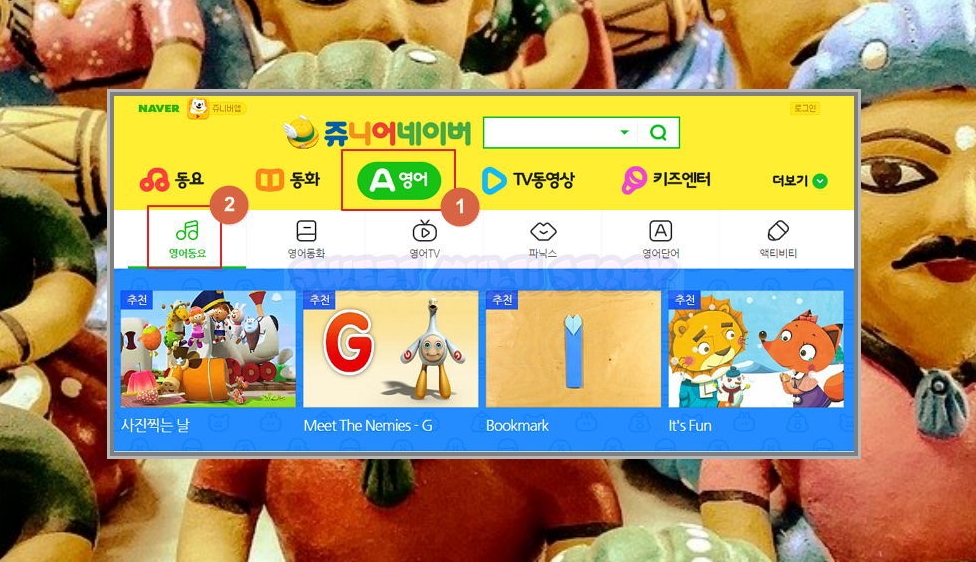 쥬니어네이버에 접속하시면 노래뿐만 아니라 동화, 학습, TV동영상 보기, 키즈 엔터테인먼트 즐기기 등을 할 수 있는데요. 영어동요 무료듣기를 하시려면 번호순서데로 클릭해주세요.