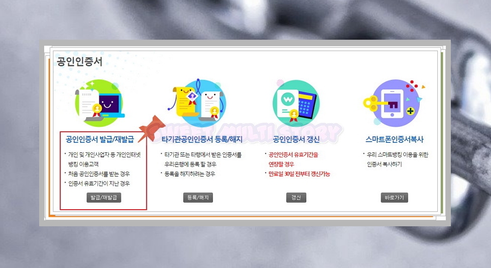4. 공인인증센터로 들어가주세요. 발급을 하기에 앞서 간단하게 공인인증서에 대해 설명을 드리자면, 온라인 상에서 전자상거래를 할 때 이용되는 인증서를 말하는데요. 본인을 인증하는 전자서명이라고도 할 수 있습니다. 영업점에 찾아가서 신분증이나 싸인, 개인인감으로 본인임을 확인하는 절차를 인터넷으로 한다고 보시면 됩니다.