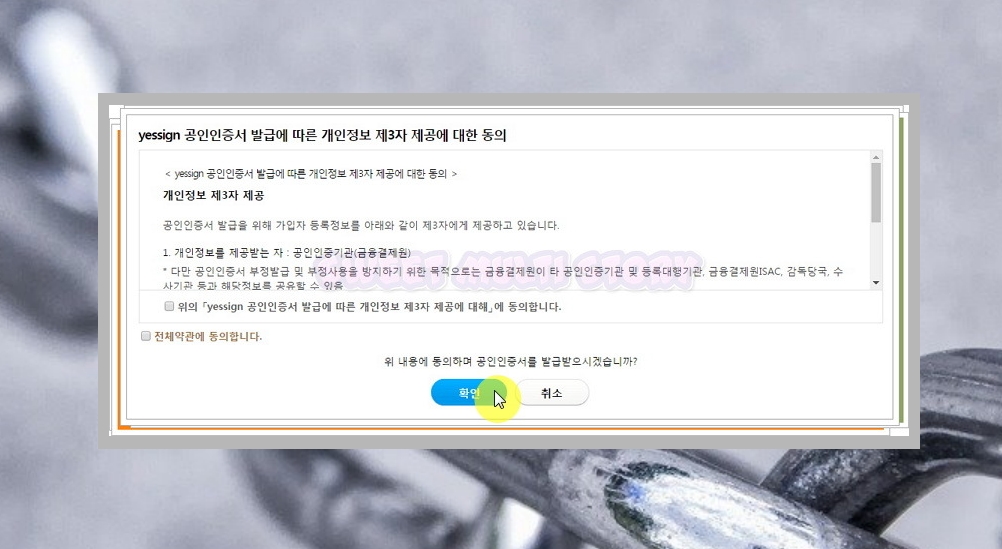 8. 약관에 동의를 하고 확인을 누르시면 간단하게 발급 받으실 수 있습니다.