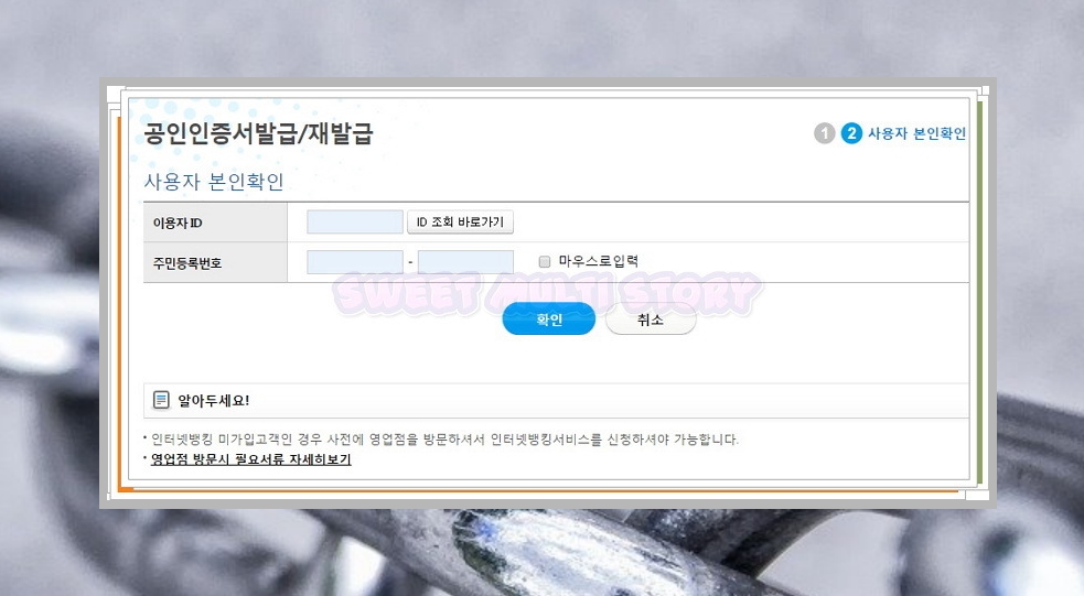 10. 일단 가장 먼저이용자ID와 주민등록번호를 알아야 합니다. 혹시 인터넷뱅킹을 가입하지 않으셨다면 유료로라도 공인인증서를 발급받을 수 없답니다. 그렇기 떄문에 꼭 인터넷뱅킹을 신청하셔야 하는데요.