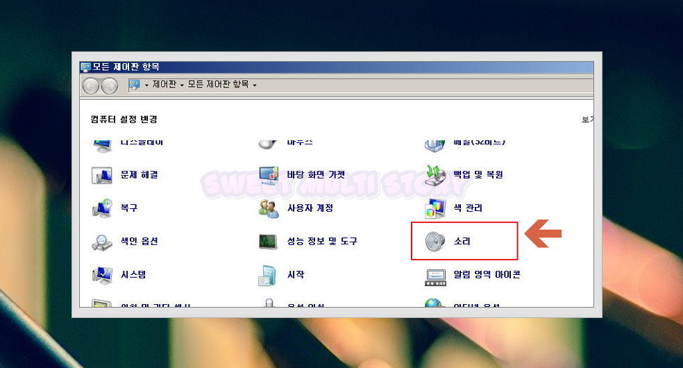 ▲ 윈도우에서 시작 버튼을 눌러 제어판으로 들어가시면 '소리' 항목이 있습니다.