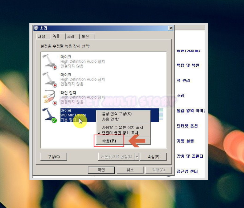 마우스 오른쪽 버튼을 누른 후 마이크 속성 페이지로 이동해야 합니다.