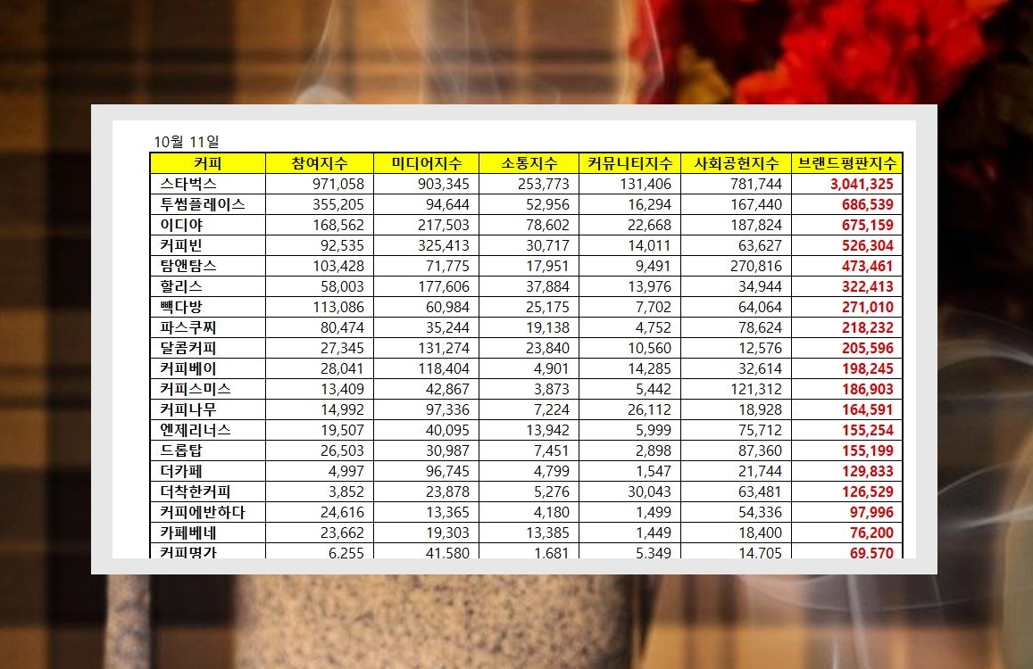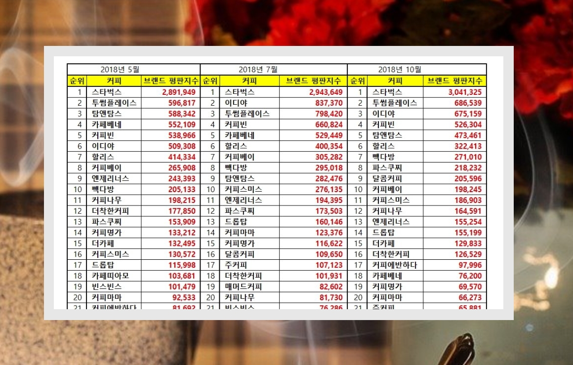 3. 브랜드 순위는 영원한 것이 아니고, 항상 변화합니다. 종류가 늘어나기도 하고요. 한국기업평판연구소에서는 분기마다 변화하는 커피 프랜드의 평판지수를 확인할 수 있어요.
