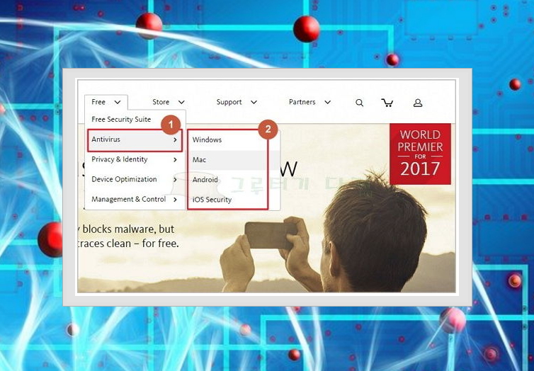 5. 우리가 필요한것은 Antivirus 입니다. 윈도우, 맥, 안드로이드, IOS 이렇게 4가지 버전이 있는데요. 일반 컴퓨터를 사용하신다면 Windows를 클릭하시면 됩니다.