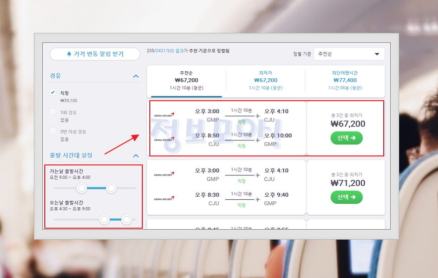 현재 찾은 제주항공권 땡처리 가격이 만족스럽지 않다면 왼쪽 위에 있는 알림 받기 서비스를 이용하시면 됩니다. 그럼 비행기표의 가격이 더 낮아졌을 때 연락을 받을 수 있어요. 여행을 하신다면 적절한 시간에 출발하고 돌아오는 것이 좋겠죠? 오른쪽에 있는 시간대 설정을 조절해주세요.