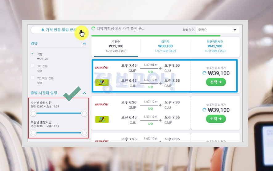 현재 찾은 제주항공권 땡처리 가격이 만족스럽지 않다면 왼쪽 위에 있는 알림 받기 서비스를 이용하시면 됩니다. 그럼 비행기표의 가격이 더 낮아졌을 때 연락을 받을 수 있어요. 여행을 하신다면 적절한 시간에 출발하고 돌아오는 것이 좋겠죠? 오른쪽에 있는 시간대 설정을 조절해주세요.