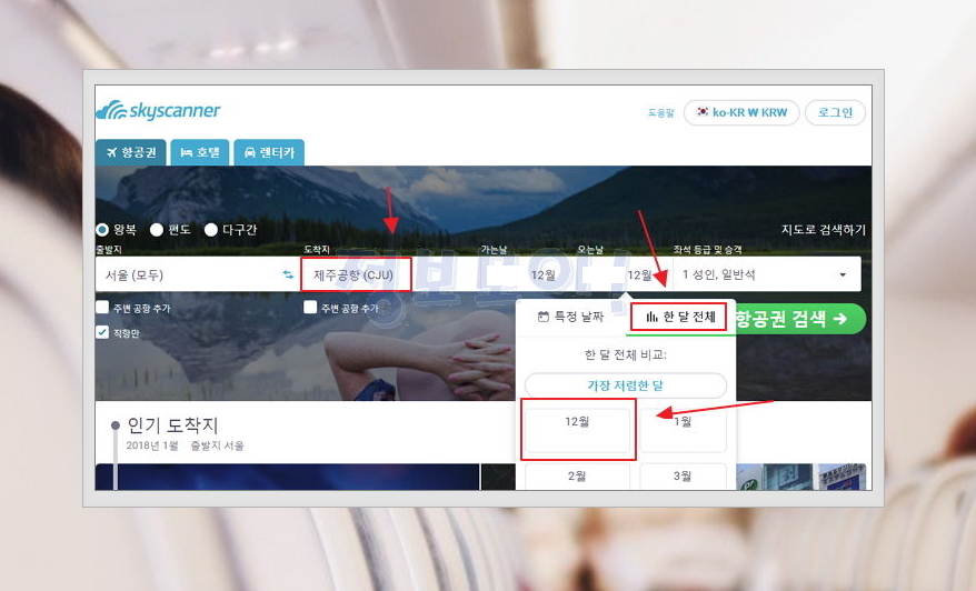 땡처리 상품을 찾기 위해서는 가는날과 오는날을 한 달 전체로 하신 후 가까운 달을 선택해야 합니다. 도착지는 당연히 제주이고요. 가까운 거리이니 만큼 직항만을 체크해주세요. 모두 입력한 이후 항공권 검색을 눌러주시면 됩니다.