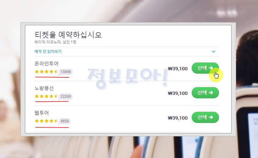 우리가 찾은 땡처리항공권의 좌석이 남았네요. 공항이용료, 항공운임, 유류할증료, 기본운임을 꼼꼼히 확인하신 후 예약하기 버튼을 누르시면 절차에 따라 쉽게 예매하실 수 있습니다.