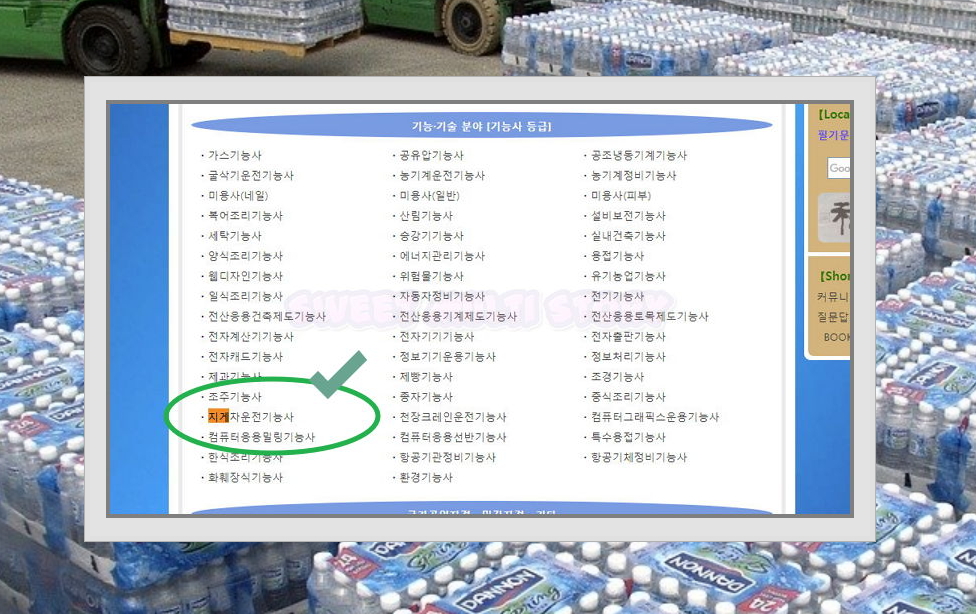 4. 생각보다 많은 자격증 이름이 나타나서 놀라고 복잡해 보일 수 있는데요. 기능 및 기술 분야 기능사 등급 카테고리에서 지게차운전기능사를 찾으실 수 있을 거에요. 이 밖에도 컴퓨터응용밀링기능사, 한식조리기능사, 환경기능사, 네트워크관리사2급 등 다양한 자격증에 대한 자료가 있으니 나중에 필요할 때 이용해 보세요.