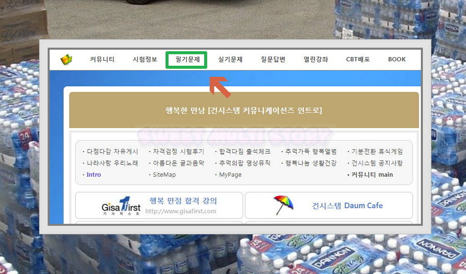 3. 이곳에서는 다양한 자격증에 대한 기사, 기능사, 기사 시험 자료를 제공하고 있어요. 특히 실습 위주인 실기문제보다는 문서화 되어 있는 필기 관련 자료가 많아요. 메뉴에서 필기문제를 클릭해 주세요.