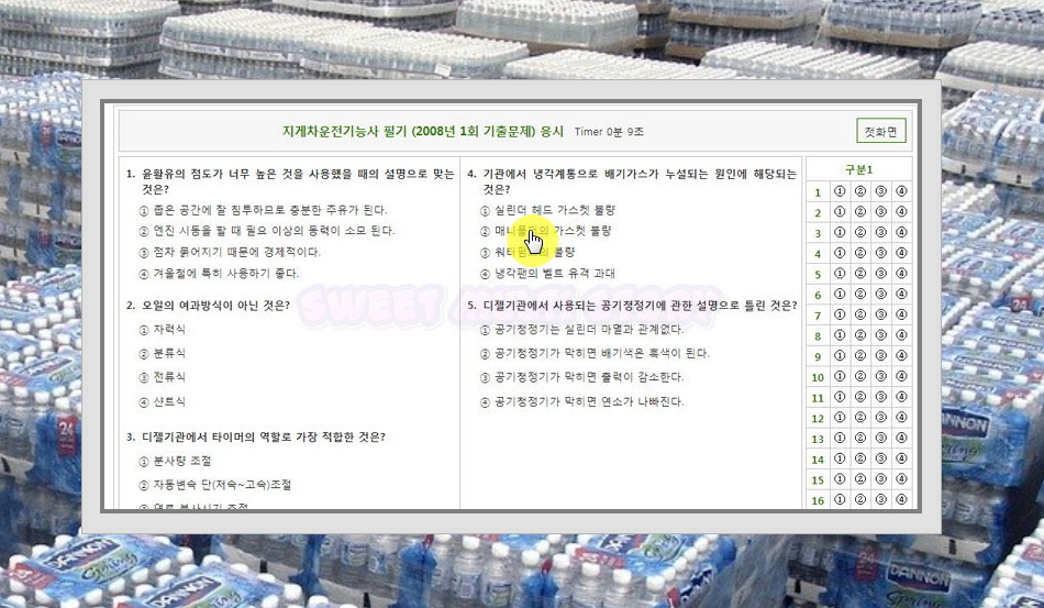 7. [응시하기] 버튼을 눌러 보았어요. 윤활유의 점도가 너무 높은 것을 사용했을 때, 오일의 여과방식, 디젤기관에서 타이머의 역할, 디젤기관에서 사용되는 공기청정기 등 지게차운전에 관련된 내용을 확인할 수 있어요. 문제를 꼼꼼히 읽고 답을 선택한 후 다음 버튼을 눌러주세요. 그럼 채점이 진행되고, 맞았는지 틀렸는지 확인할 수 있어요.