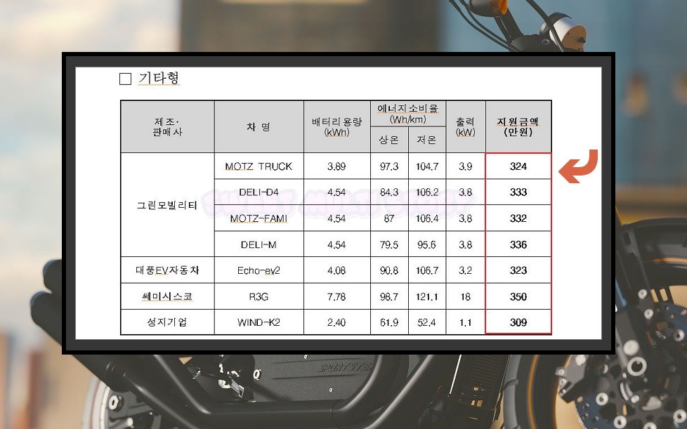2. 기타형으로 분류되는 오토바이의 경우 309만원에서 350만원까지 지원을 받을 수 있어요. 그린 모빌리티, 대풍 EV 자동차, 쎼미시스코, 성지기업의 일부 모델의 경우 구매 시 적용이 돼요. 전기 오토바이 구매보조금과 함께 각 모델의 배터리 용량, 에너지 소비율, 출력을 확인할 수 있으니 참고해 주세요.