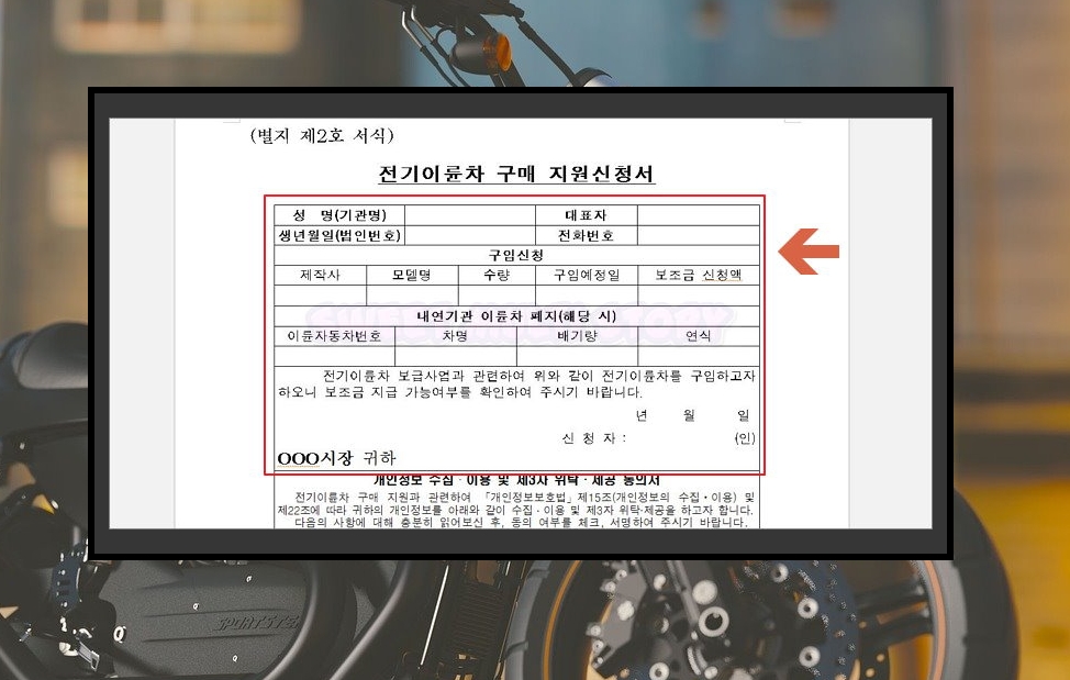 5. 전기이륜차 구매 지원신청서는 이렇게 생겼어요. 환경부 사이트에서 쉽게 받을 수 있는 양식이에요.