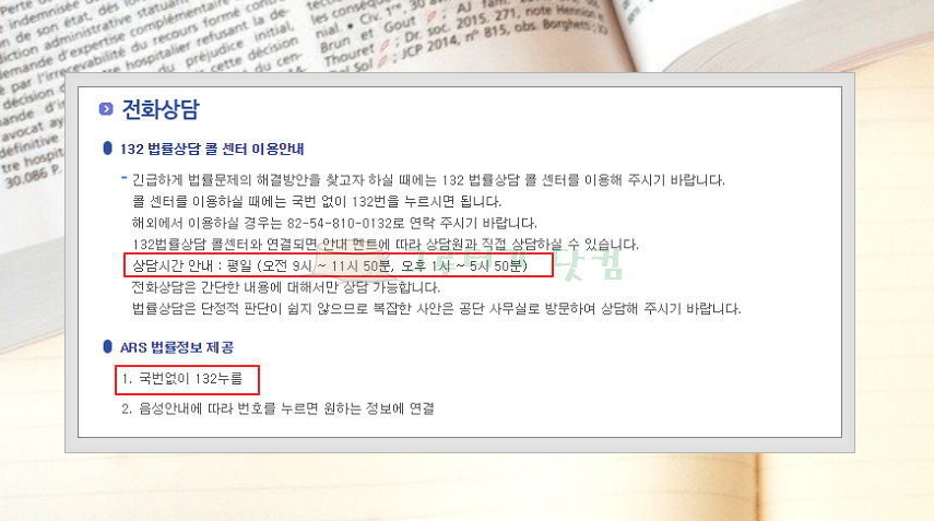 국번없이 132를 누르면 어디서든 해당 센터에 연락하실 수 있는데요. 시간이 정해져 있습니다. 평일 오전 9시부터 11시 50분까지 그리고 오후 1시부터 5시 50분 사이에만 이용하실 수 있어요. 해외에서 전화상담을 받고 싶은 경우에는 번호가 다르오니 참고해주세요.